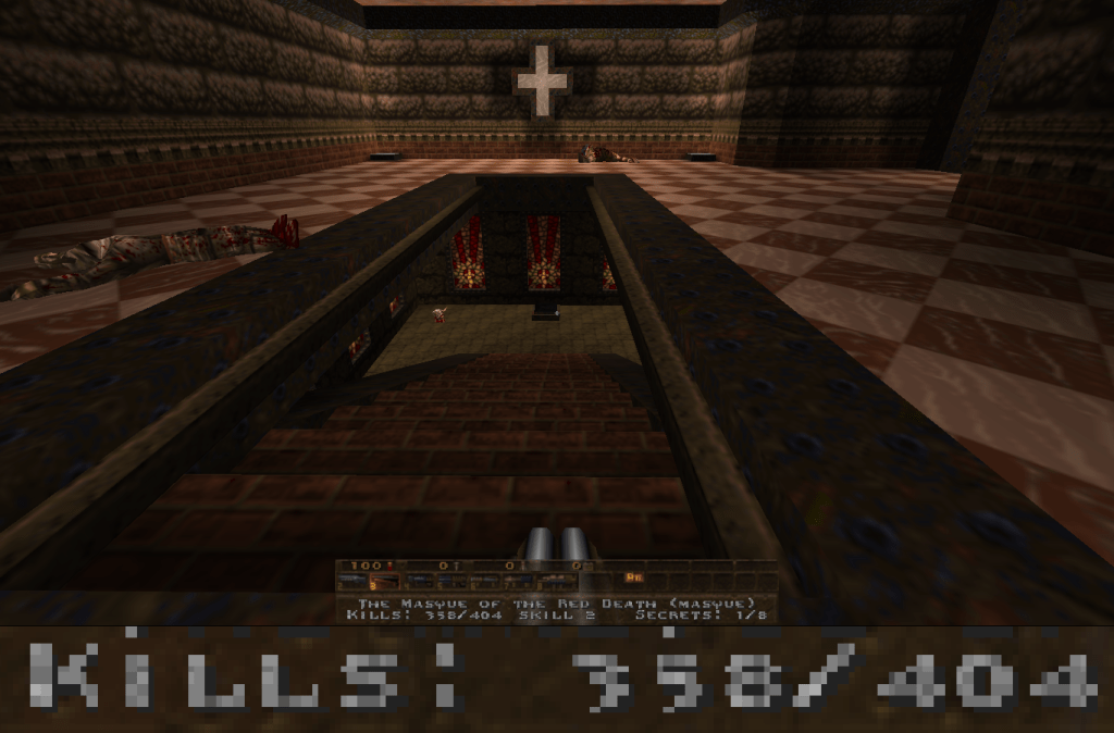 Then are more vanilla offerings that provide a classic experience – meaning no new monsters, no changes to weapon or monster behaviour, no complex scripting and minimal or no use of new textures. Masque of the Red Death by Tronyn is one of those. It’s a mostly vanilla offering sticking closely to the design of the original Quake, just larger and far more action packed than the original levels.