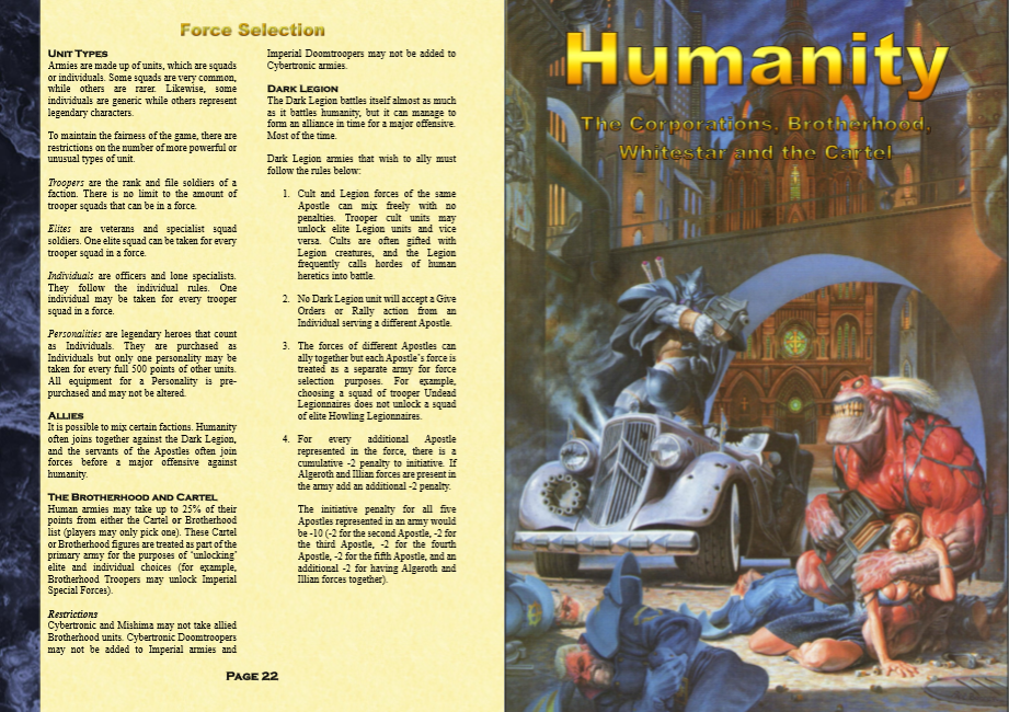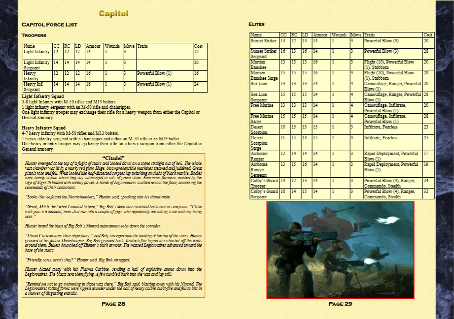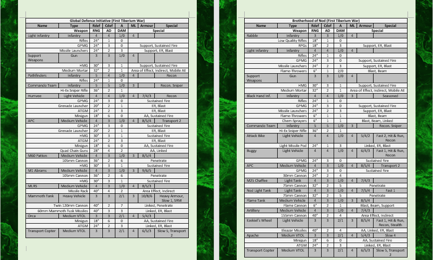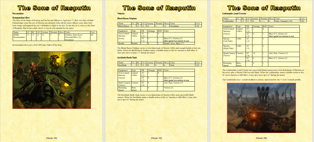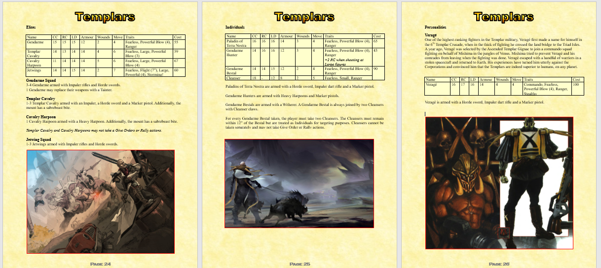 I’ve written up a booklet that contains new armies and quick reference lists for existing armies (high power armies like the Darghaur aliens have a LOT of modifiers). Every army is based on existing miniatures (The Scene UK, Ground Zero Games, Critical Mass Games, Slap Miniatures, and Vanguard Miniatures).